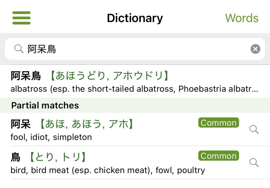 This begs the question: which is more correct? Well, 阿呆鳥 is defined in the Japanese dictionary as “Albatross”, but the word is made up of two shorter words – 阿呆 meaning “idiot” or “fool,” and 鳥 meaning “bird”.