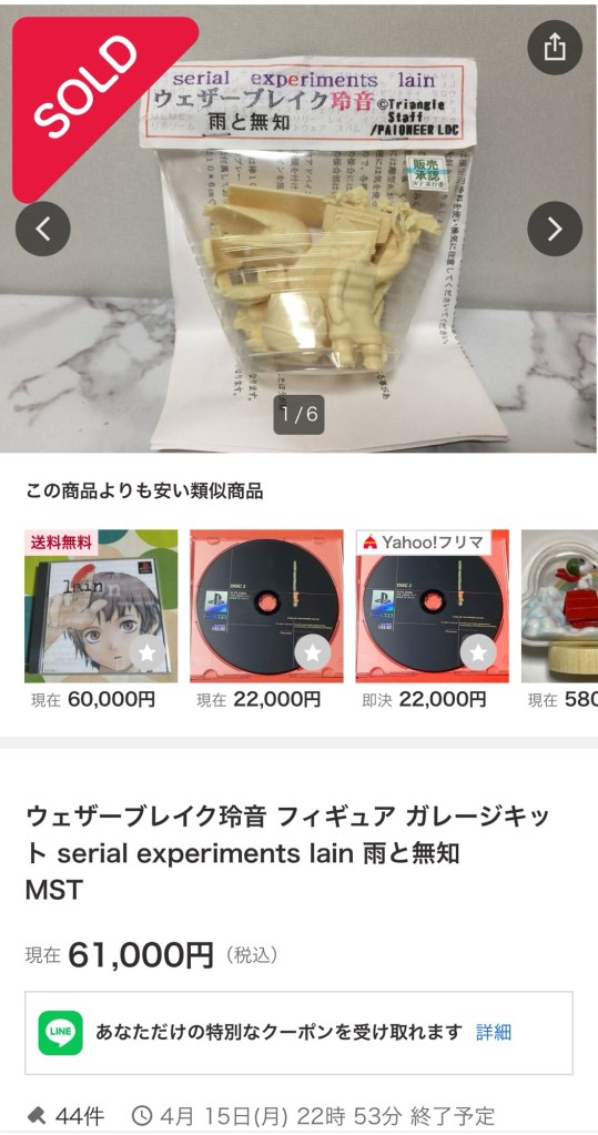 While Grifons’ Garden released a number of Lain garage kits in the early 2000’s, these kits have become quite expensive. Finding an unpainted (and unbroken) garage kit is quite a rarity, with only one to two being listed each year, if any. Prices commonly reaching north of $300 USD each at auction, weeding at all but the most hardcore (and wealthy…) of fans.