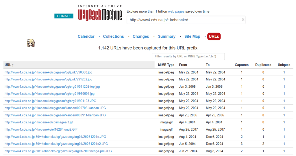 Moving back to the Internet Archive, I plugged in the new URL and checked the sitemap – we were in business! Over a thousand saved pages, mainly spanning from 1999 to 2004. It seems sometime after 2004 the website was abandoned and eventually went offline… I hope kobaneko is doing well.