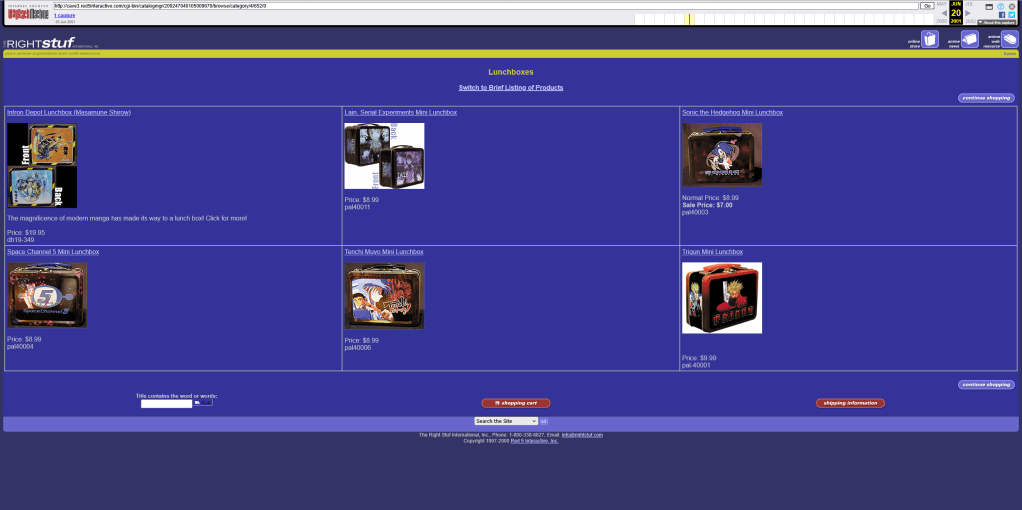 Unfortunately, basically all links to the old shop on the Right Stuf website are completely broken – they all use a host called “cave3.red5interactive.com” that did NOT age well, and the weird cursed URL formats that it uses do not play well with the internet archive at all. A few rare pages have been archived, but I only found a single shop page that had the Lain lunchboxes on it – and it was the miniature ones: