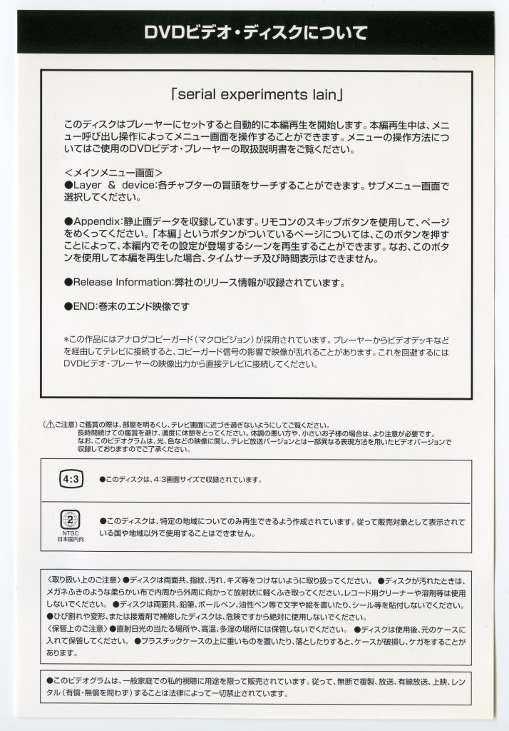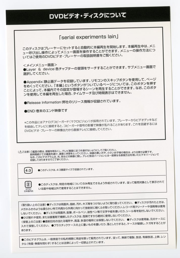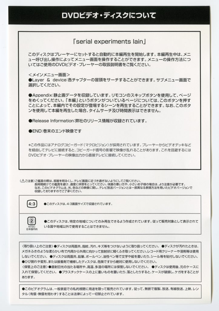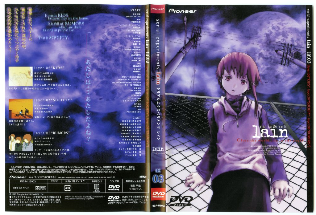 This page holds various scans I’ve taken of Serial Experiments Lain DVDs, VHS tapes, CDs, and other related merchandise. The scans have been separated by country of origin for easy navigation.